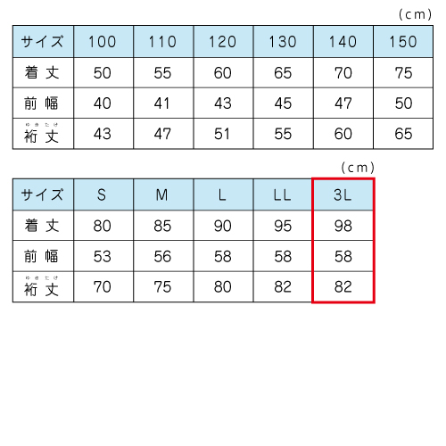 | サイズ | 【3L】 ●サイズ 3L 着 丈 98cm 前 幅 58cm 裄 丈 82cm |