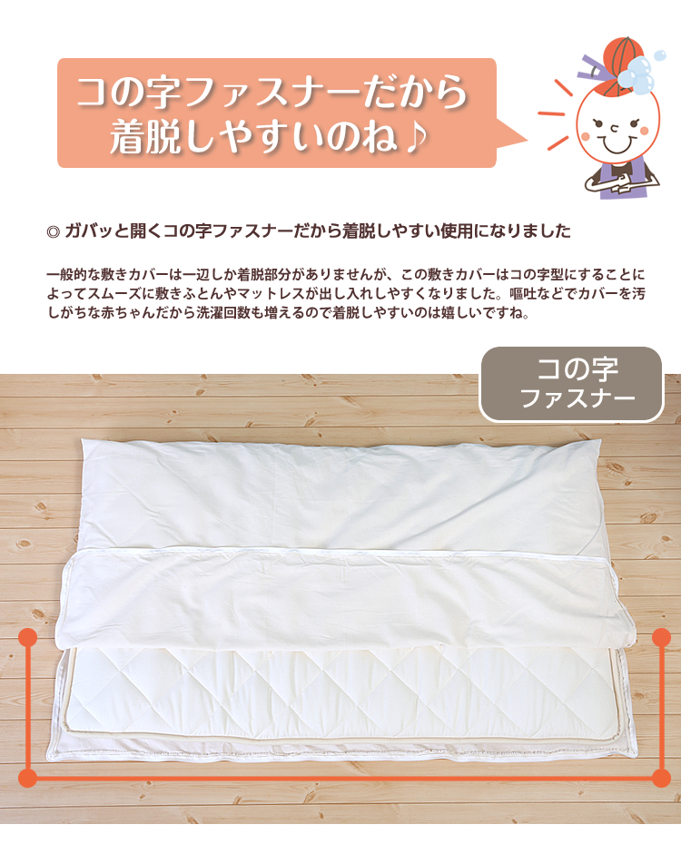 | 商品説明 | 綿100%の日本製の敷き布団カバー。出し入れしやすいようにコの字ファスナーを採用しました。なかなか洗えない敷布団が汚れないように清潔に保ちます。赤ちゃんを綺麗な環境で眠らせてあげるための必須アイテムです。やさしい色合いの6色をご用意しました。 |