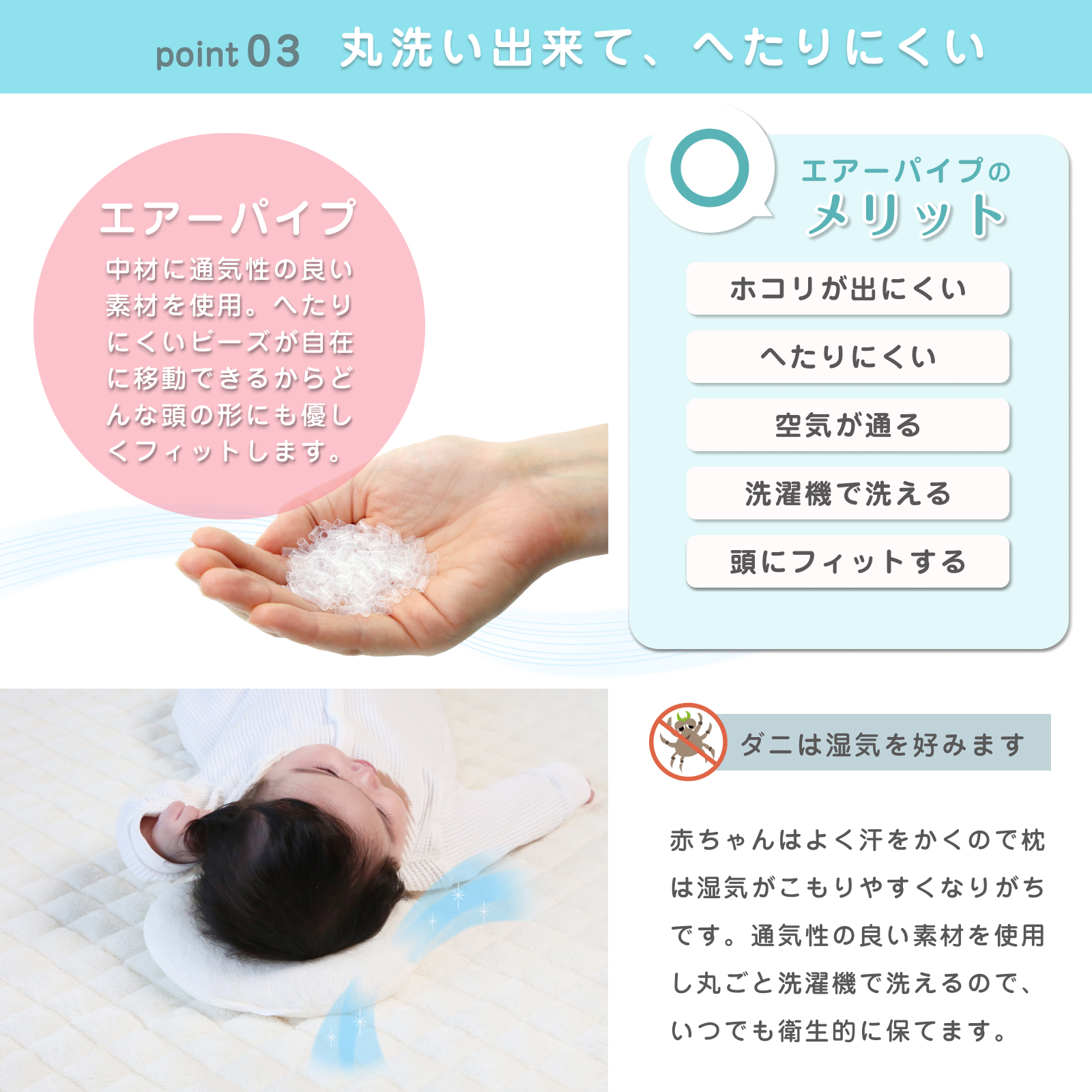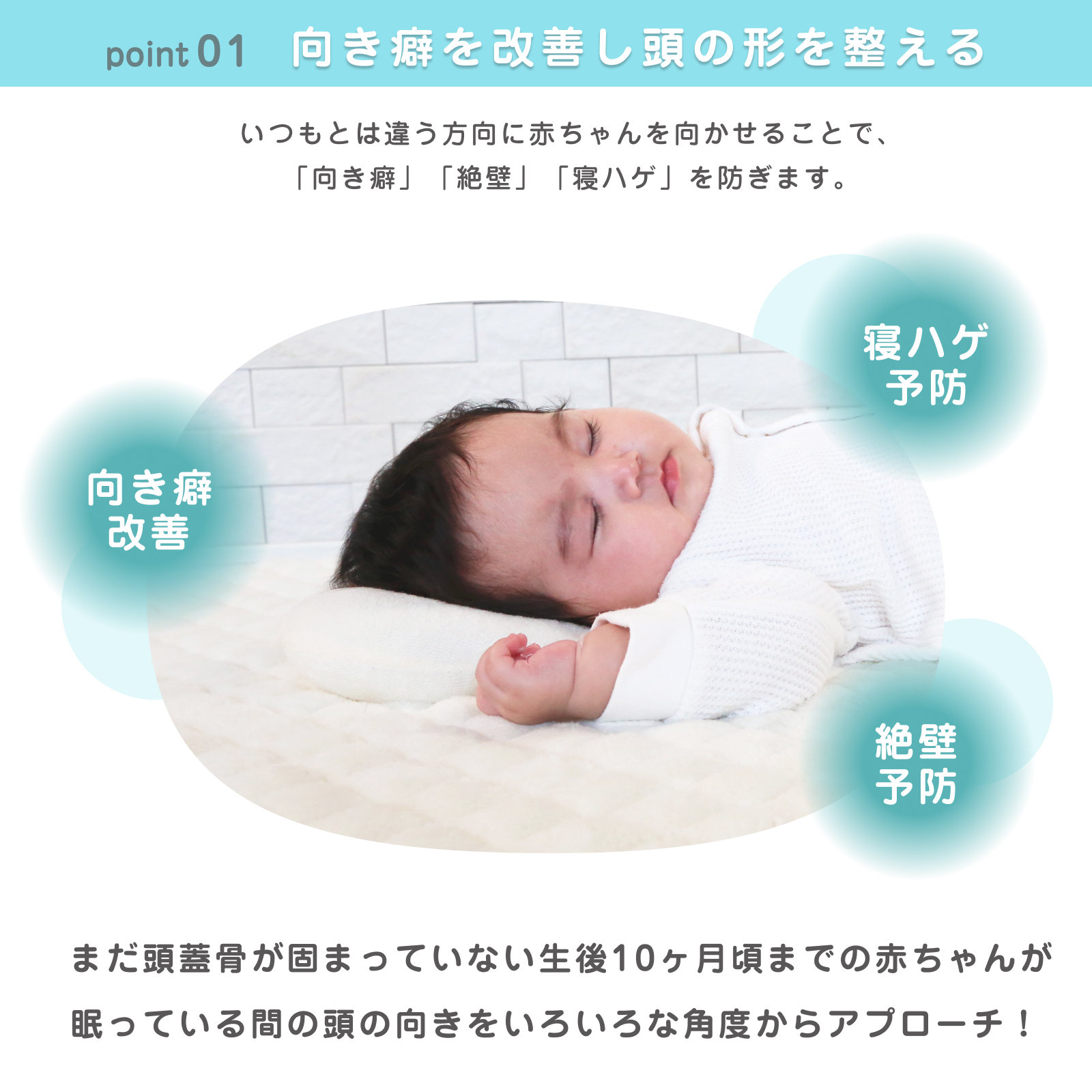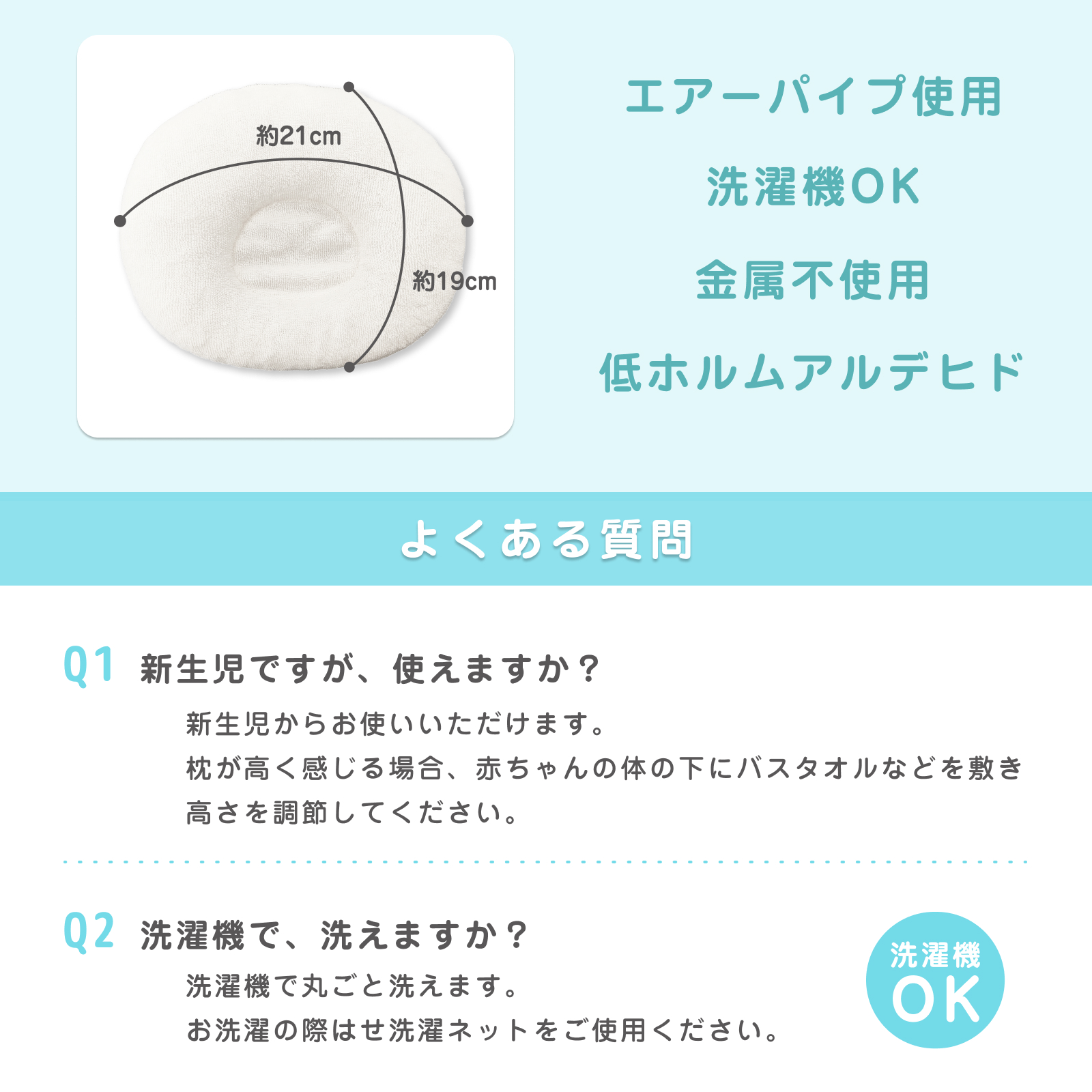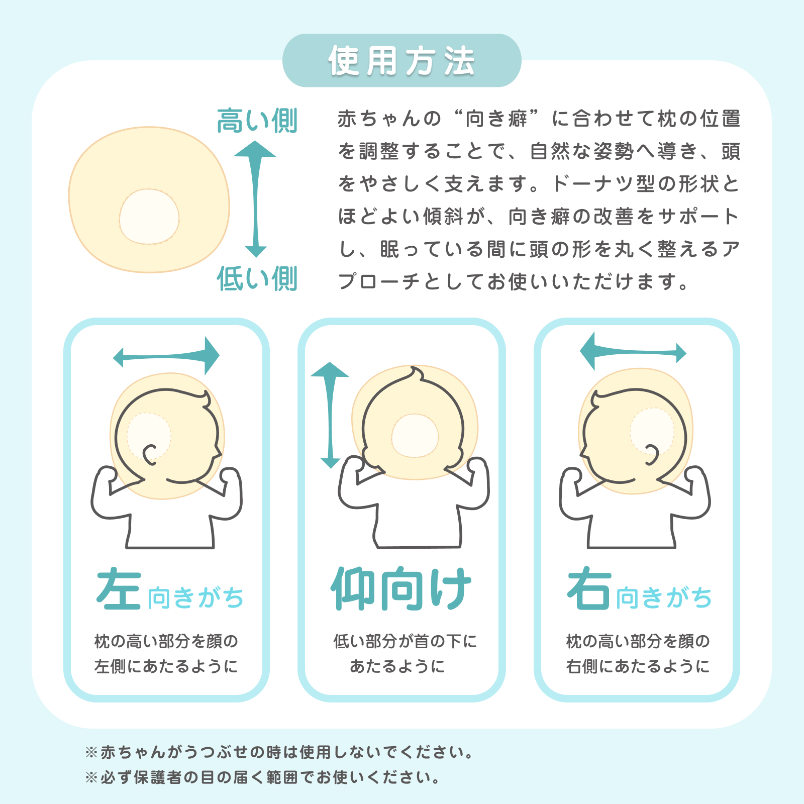 | 商品説明 | 【対象年齢】新生児から〜 赤ちゃんの頭の形を整えてくれるドーナツ型まくらです。 いつもとは違う方向に赤ちゃんを向かせることで、「向き癖」「絶壁」「寝ハゲ」を防ぎます。 中材には通気性のよいエアーパイプを採用。 「ホコリが出にくい」「蒸れにくい」「へたりにくい」などの特徴があります。 洗濯機で丸洗いできるのも嬉しいポイント。 赤ちゃんの頭にやさしくフィットします。 |
