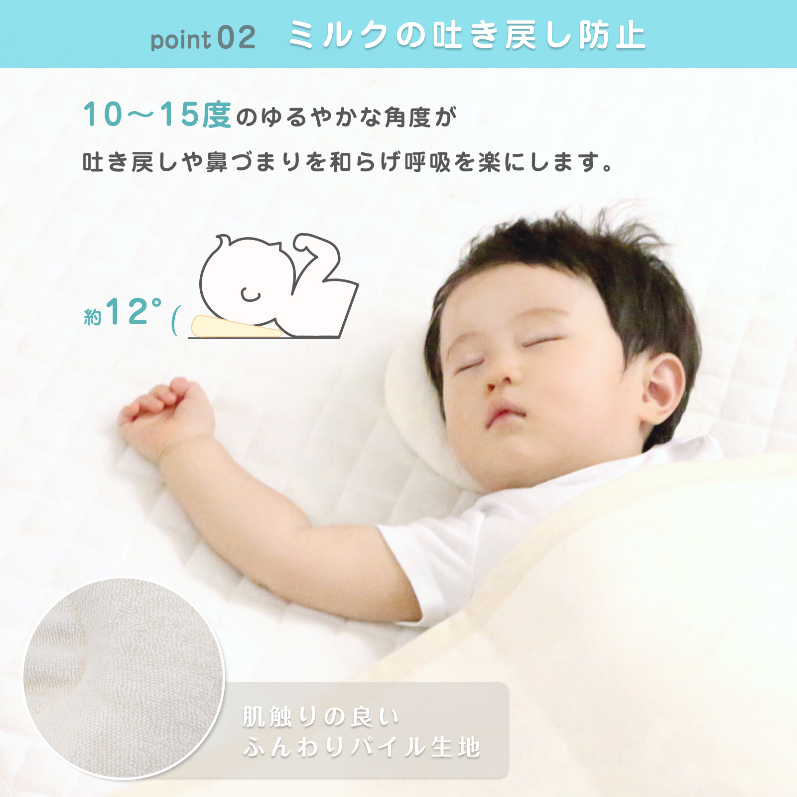 | 注意点 | ●保護者の目の届く範囲内でご使用をお願い致します。 ●赤ちゃんがうつ伏せになって寝ているときは使用しないでください。 ●撮影状況やモニターの設定などの違いにより、実際の色合いと多少異なる場合がございます。 ご理解の上、お買い物をお楽しみください。 【洗濯時の注意点】 ・洗濯ネットをご使用ください。 ・無蛍光洗剤をご使用ください。 ・洗濯後形を整えてから干してください。 |