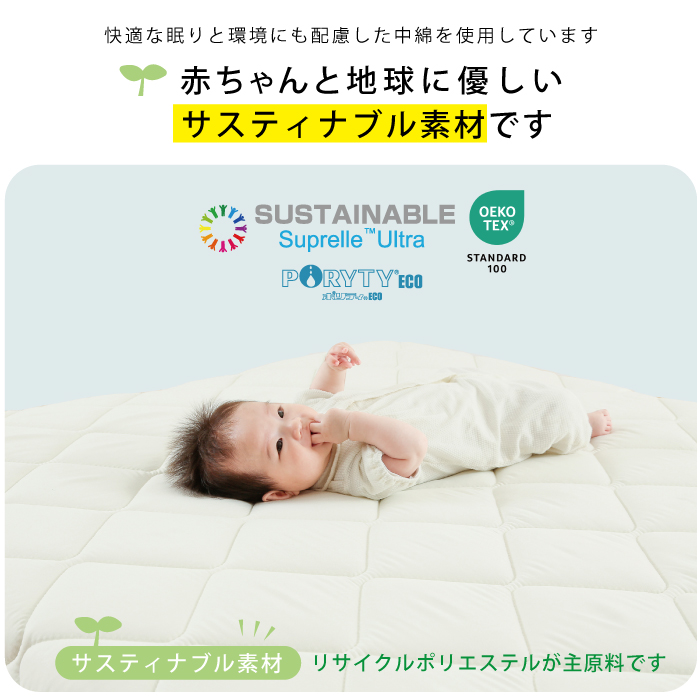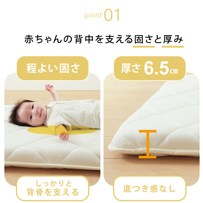 | しっかりとした厚みがあるので、お昼寝はもちろん就寝用にもご使用いただけます。 プレイマット代わりにもなる万能敷きふとんです。 Point1: 「寝返りマットレス コンパクト」はしっかりした高密度の固綿を柔らかい綿で挟み込んだ3層構造となっております。 Point2: 厚みがあるから底付き感なくまだ未発達の赤ちゃん骨格をしっかりと支えます。【ドイツ製 抗菌・防臭・防ダニの中綿】で高密度固綿を包み込む3層構造だからへたりにくく、赤ちゃんの快適な眠りをサポートします。 Point3: 赤ちゃんが寝返りしやすく、お母さんも添寝をしながら寝かしつけできます。通常のベビー敷きふとんのサイズよりも大きい作りになっています。寝返りをしやすいようにワイドに90cmあるので赤ちゃんのお昼寝やプレイマットとしても自由に遊べます。 よだれや寝汗の浸み込み防止のため、別売りの防水シーツやキルトパッドを合わせてご使用いただくことをオススメ致します。 |