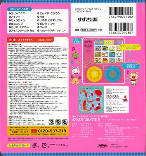 | 商品説明 | 『ちょうちょう』『どんぐりころころ』『いぬのおまわりさん』など、どの世代にも親しまれている曲に加え、『エビカニクス』『さんぽ』など今どきの人気曲もおさえた童謡音えほんの決定版。押すと光って楽しいリズムボタンでリズム遊びをしたり、カラオケを楽しんだりもできる、盛りだくさんの内容です。 ●うた・カラオケきりかえボタン付き ●音量とテンポ調整可 ●押すと光るリズムボタン付き 【収録曲(全12曲)】 ・エビカニクス ・アイアイ ・ちょうちょう ・かたつむり ・もりのくまさん ・アイスクリームのうた ・どんぐりころころ ・ゆき ・いぬのおまわりさん ・おにのパンツ ・さんぽ ・ハッピーバースディトゥユー 初版発行日:2018-10-15 対象年齢:0歳から 単4マンガン電池2本(試験電池)入り |