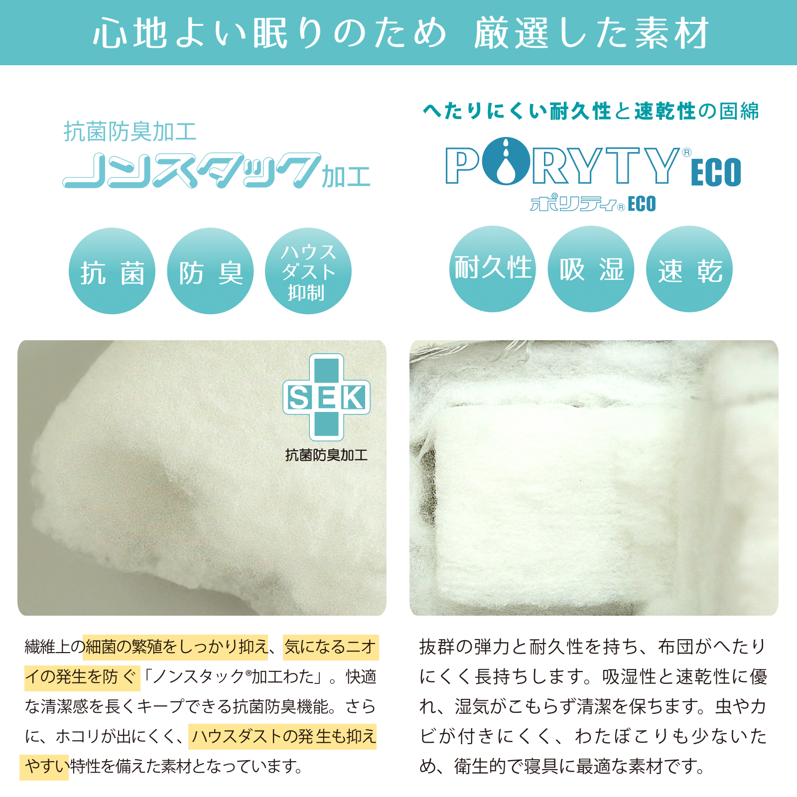 | ●マットレス 【側生地】ポリエステル 100% 【中綿】ポリエステル 100%(ノンスタック加工) 【固綿】ポリエステル 100%(PORYTY) |