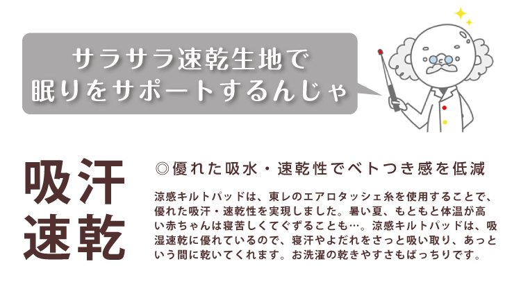 | 商品説明 | ベビーサイズの敷き布団にぴったりサイズの吸汗・速乾・ちょっぴりひんやり感の敷きマットです。四隅ゴム付きで脱着がらくちん。 |