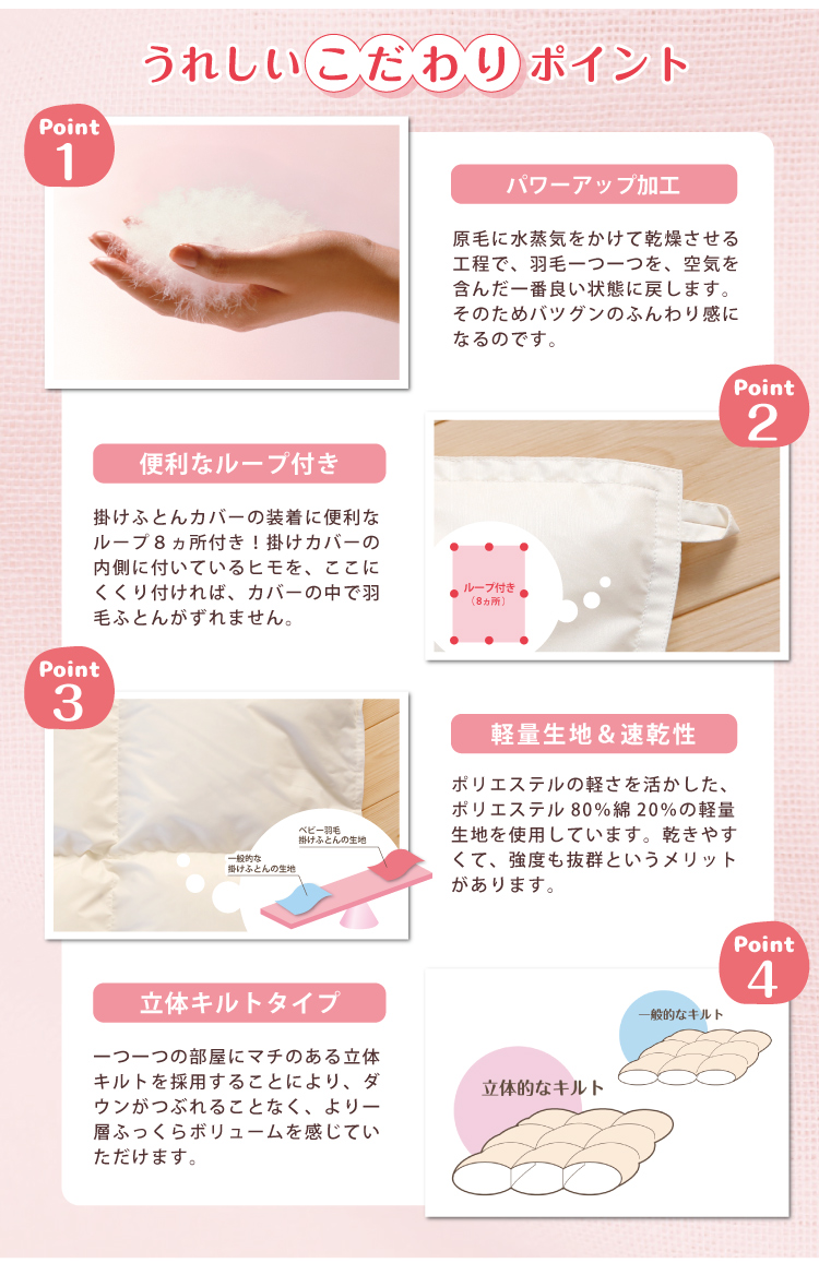 | 商品説明 | 「暖かさ」「軽さ」のことを考えると、やはり羽毛ふとんに敵うものはありません!「ニューゴールド羽毛ふとん」はボリューミーなのにとってもリーズナブルなので、「まずは羽毛ふとんを試してみたい」という方にオススメです。 立体キルト加工(羽毛がつぶれにくい加工)やダウンプルーフ加工(羽毛が飛び出しにくくする加工)などが施されており、リーズナブルですが充実のクオリティーです。プレゼントにも喜ばれますよ。 |